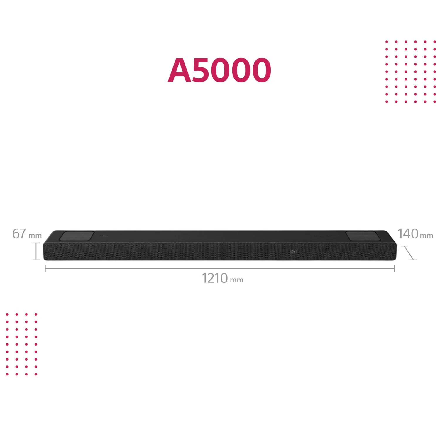 The HT-A5000 envelops you in authentic 5.1.2 channel surround sound with up-firing speakers, side beam tweeters, and a built-in dual subwoofer. And with optional rear speakers it supports 360 Spatial Sound Mapping, taking movies, TV and music into a whole new realm.
